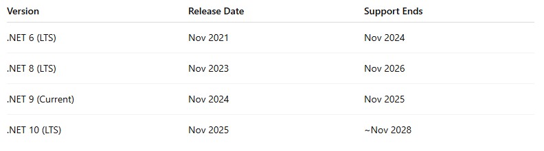 Starting with .NET 5, Microsoft adopted a predictable yearly release cycle: odd-numbered versions (like .NET 7 and 9) are “current” (short-term), while even-numbered versions (like .NET 6, 8, and upcoming 10) are LTS (Long-Term Support).