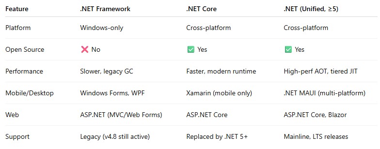 Today’s unified .NET platform (versioned yearly: 6, 7, 8, 9…) merges the best of both worlds. It offers: